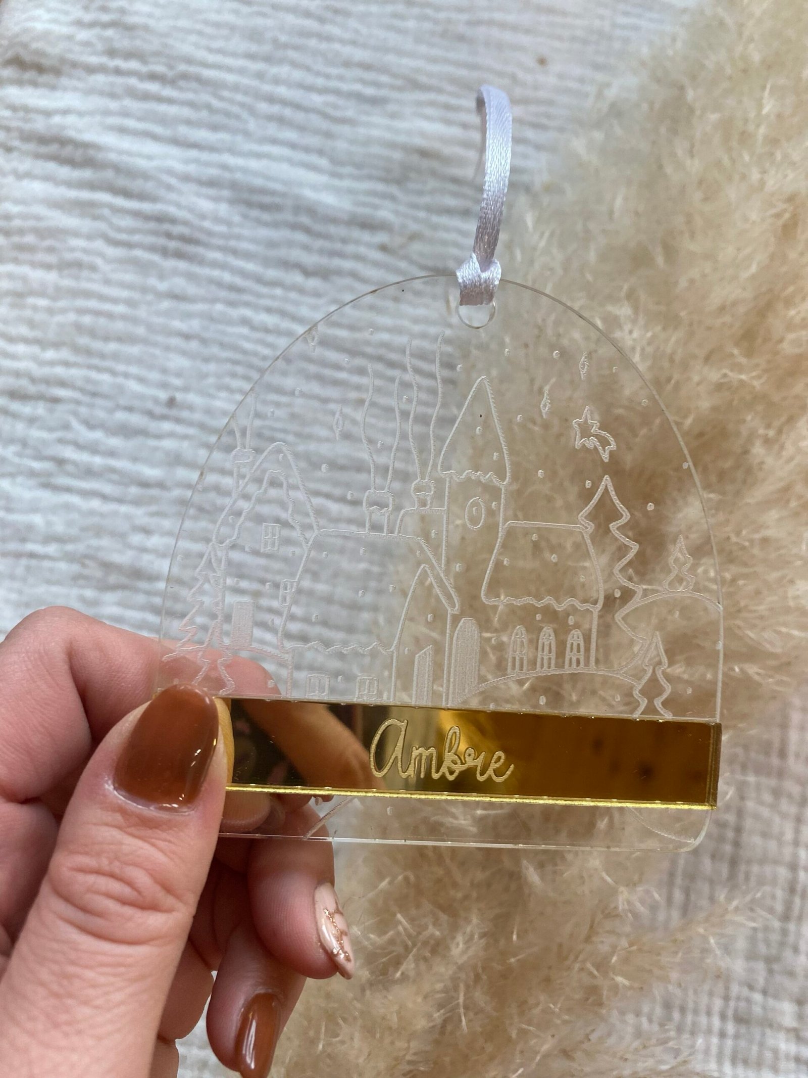 Boule transparent avec village de noël sous la neige. Prénom a graver sur le plexi doré.